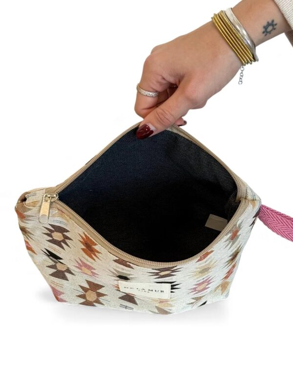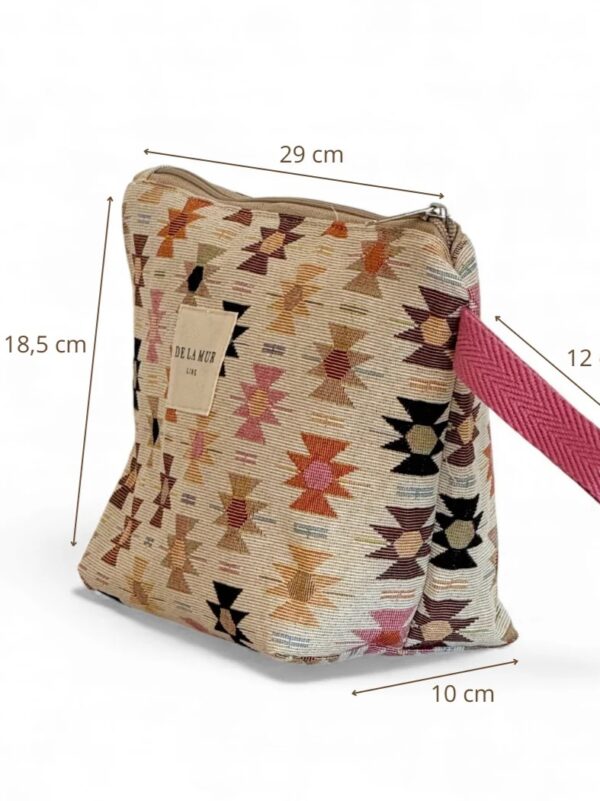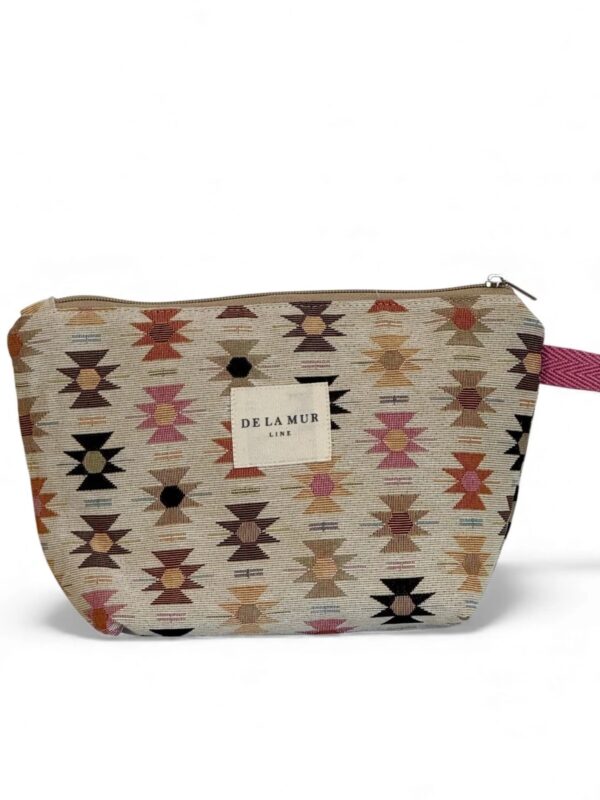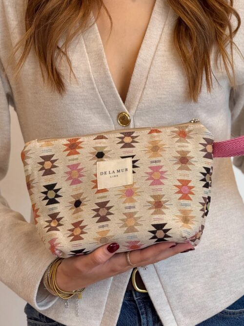 Neceser, tamaño grande, con cremallera en la parte superior y con asa lateral de cordón de color teja. Modelo confeccionado con tejido grueso de jacquard (80% algodón y 20% poliéster) con estampado geométrico en tonos rosa y naranja sobre fondo beige. Ideal para ir de viaje, a la playa, para uso en el día a día. Confeccionado con telas nacionales en España.