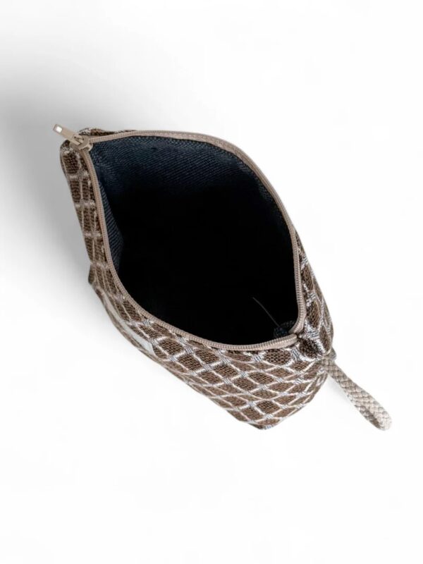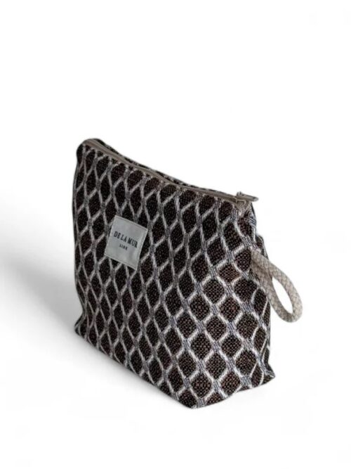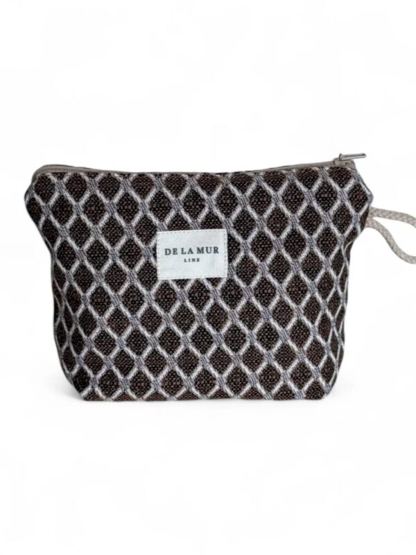 Neceser con cremallera en la parte superior y asa corta de cordón en el lateral. Modelo confeccionado con tejido grueso de jacquard con estampado geométrico marrón y beige. Ideal como multiusos para el día a día.