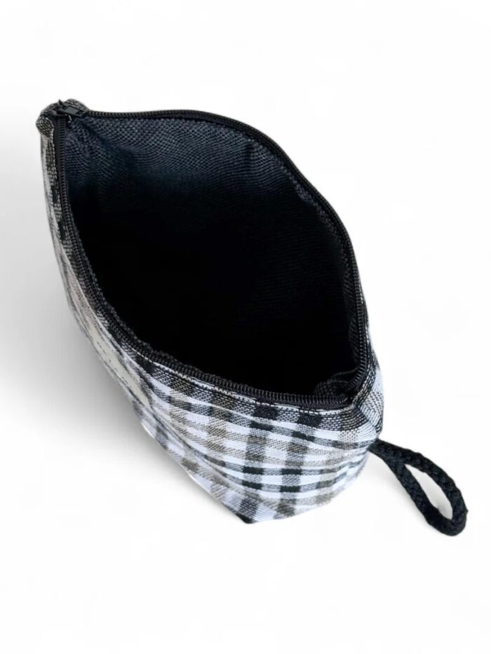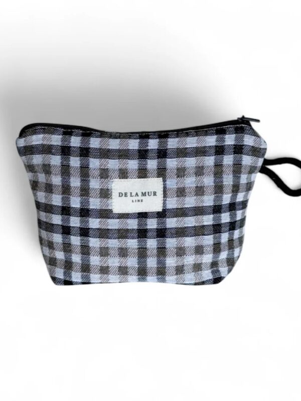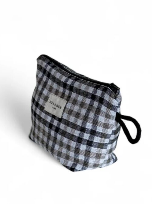 Neceser con cremallera en la parte superior y asa corta de cordón en el lateral. Modelo confeccionado con tejido grueso de jacquard con estampado a cuadros de color beige y negro. Ideal como multiusos para el día a día.