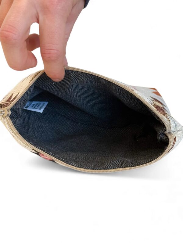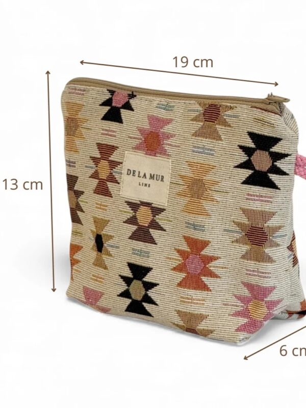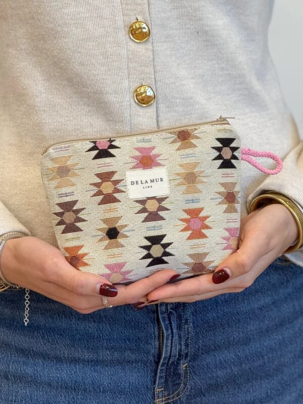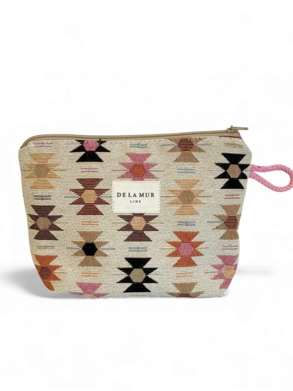 Neceser pequeño con cremallera en la parte superior y con asa lateral de cordón de color teja. Modelo confeccionado con tejido grueso de jacquard (80% algodón y 20% poliéster) con estampado geométrico en tonos rosa y naranja sobre fondo beige. Ideal para guardar cualquier cosa, multiusos y para el día a día. Confeccionado con telas nacionales en España.