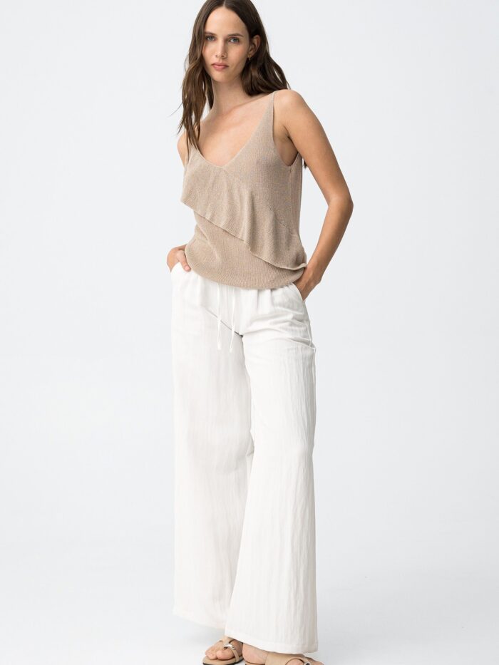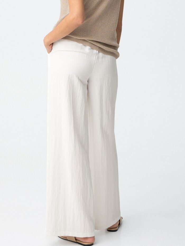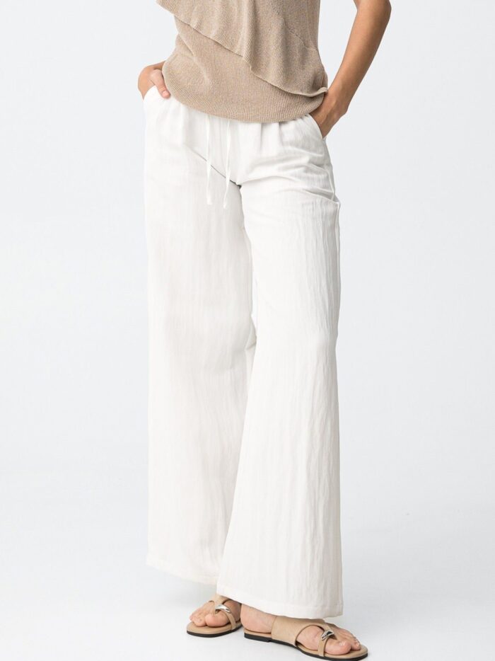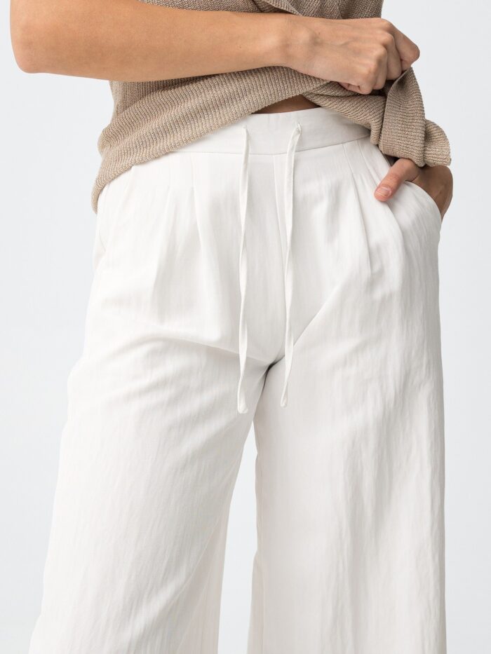 Pantalón de tiro alto y corte fluido con pernera ancha, en color blanco, de la firma Tiffosi. Modelo diseñado con bolsillos delanteros y detalle de pinzas para un toque de clase. Confeccionado en tejido suave y fresco cuenta con elástico en la cintura por detrás y cinta por delante para asegurar un ajuste personal.