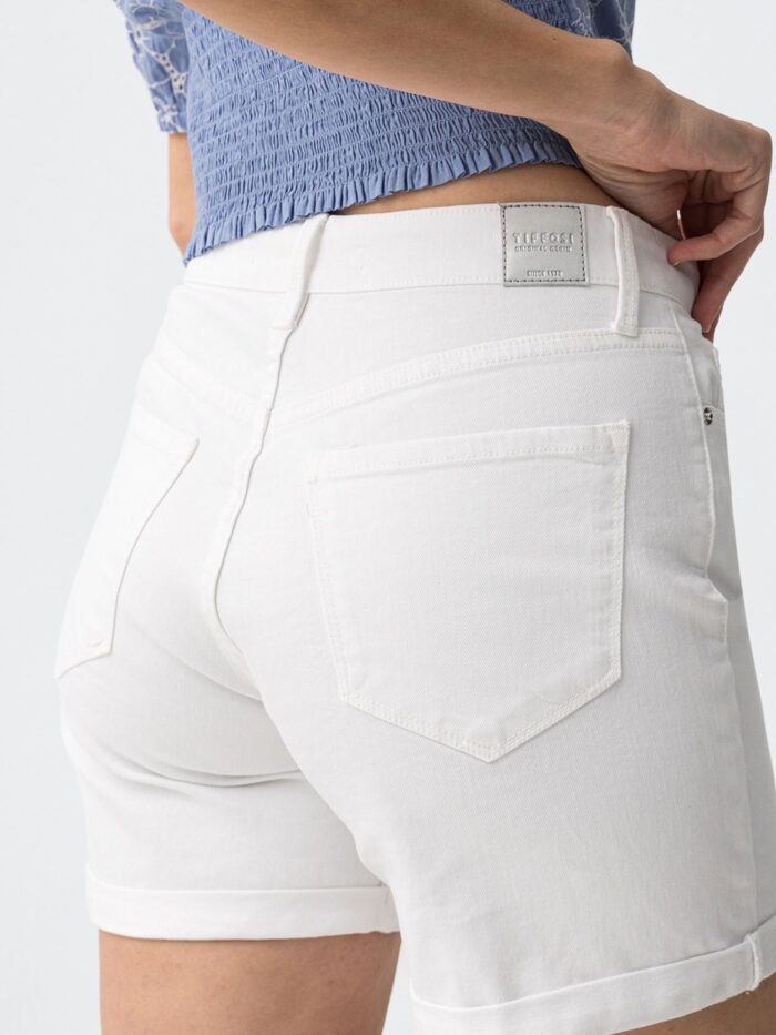 Pantalón corto, en color blanco, de Tiffosi. Modelo cinco bolsillos, de corte ajustado y cintura de talle medio, diseñado con bajo con vuelta cosida en los laterales. Fresco, cómodo e ideal para lucirlo todo el verano con camisetas, camisas o blusas creando tu propio look.