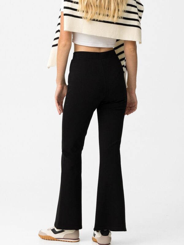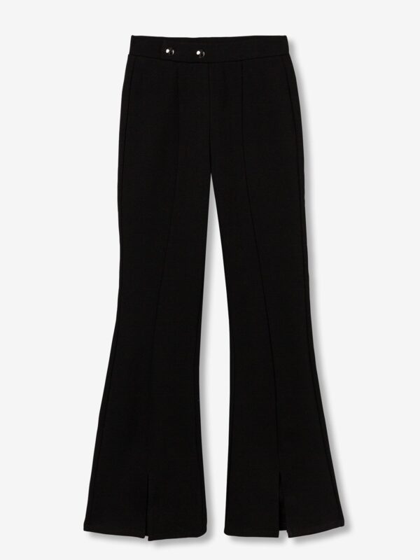 Pantalón, tipo leggings, confeccionado con tejido elástico y diseñado con pierna recta y camal acampanado. Modelo de cintura alta con cinturilla estructurada y dos botones frontales decorativos. Detalle de bajo con abertura frontal.