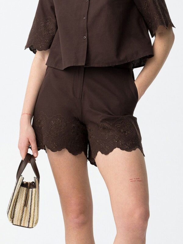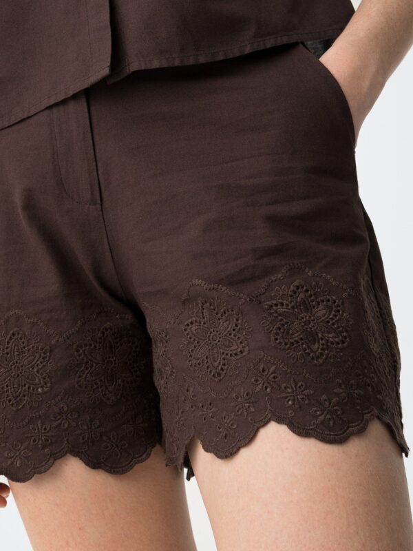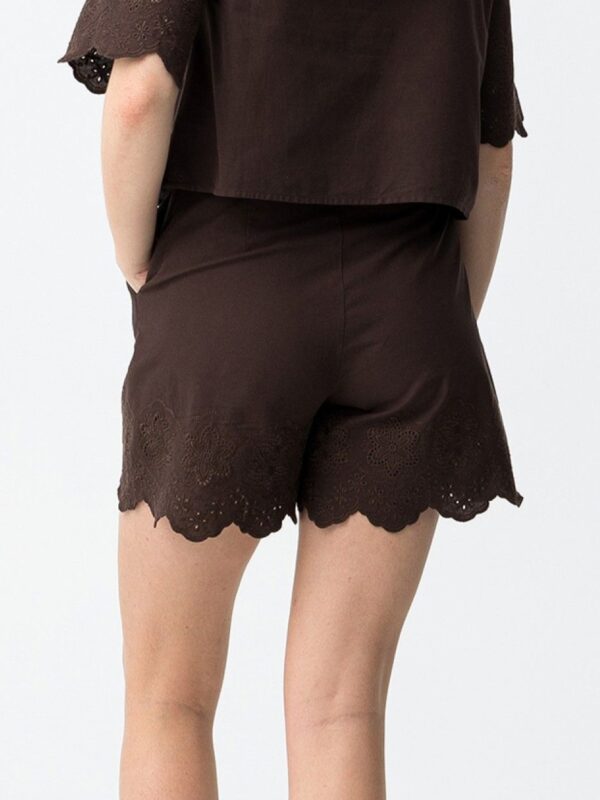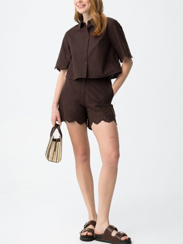 Short marrón chocolate, de la firma Tiffosi, confeccionado en algodón. Modelo diseñado con bolsillos laterales y cierre frontal con cremallera, enganche y botón. Detalle de bordado con calados en el bajo tanto por delante como por detrás. En la cintura cuenta con trabillas para incorporar un cinturón si así se prefiere.