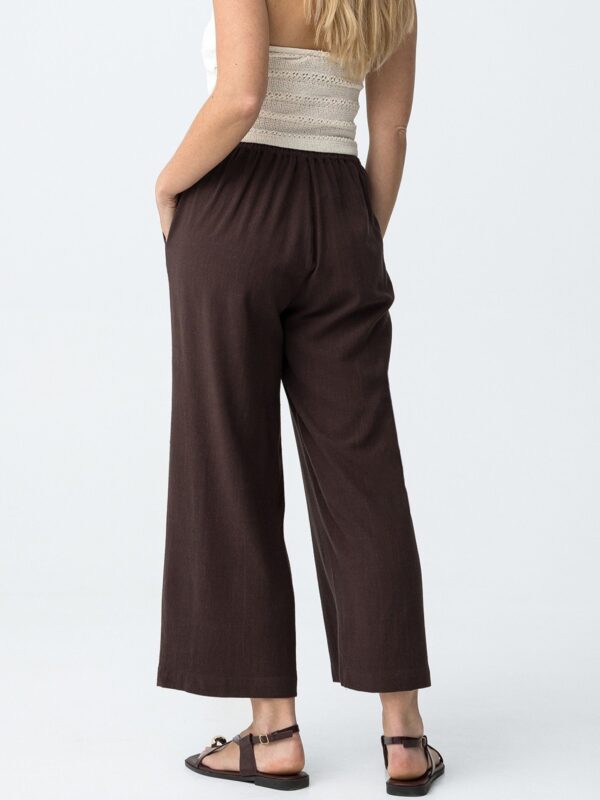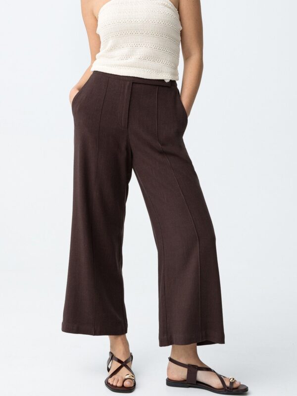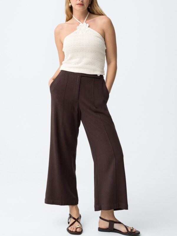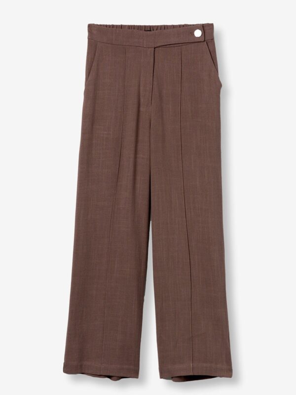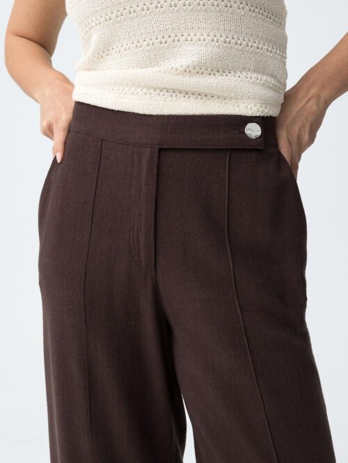 Pantalón de tiro alto y corte fluido, en color marrón chocolate, de la firma Tiffosi. Modelo diseñado con bolsillos delanteros y cierre de cremallera y botón metálico. Confeccionado en tejido mezcla de lino aporta frescura y comodidad y el elástico en la cintura por detrás proporciona un ajuste personal.