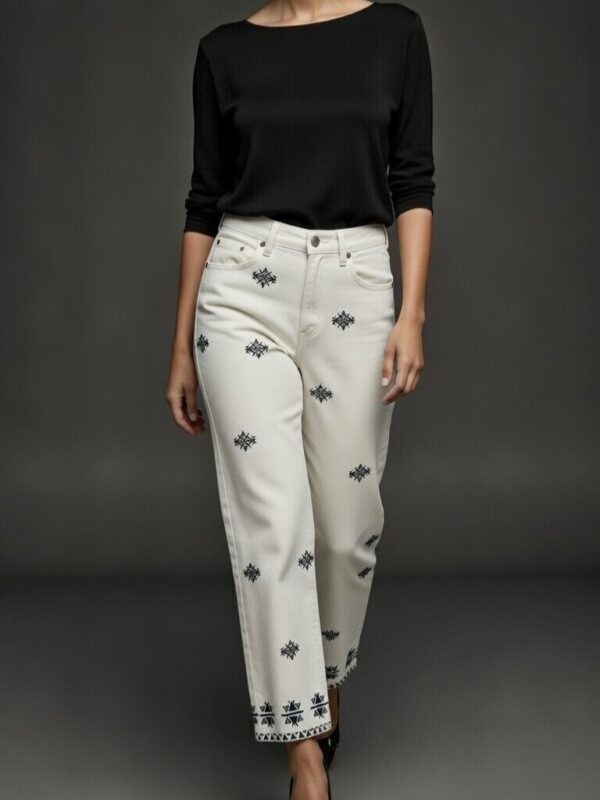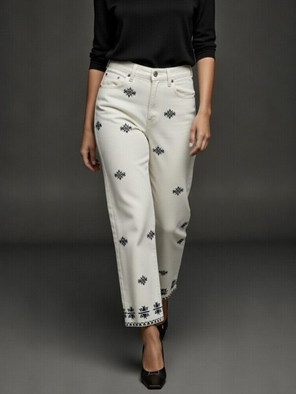 Jeans de tiro alto, en color blanco roto, con pernera recta para un look casual y a la moda. Modelo cinco bolsillos con bordados en la parte delantera en hilo azul marino de figuras geométricas y cierre frontal con cremallera y botón metálico. El bajo presenta bordados del mismo estilo para no pasar desapercibida por donde quiera que vayas.
