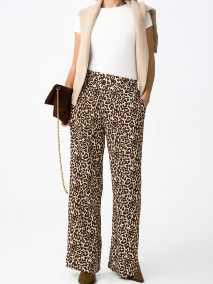 Pantalón fluido, de pierna recta y ancha, con elástico en la parte trasera de la cintura. Modelo con bolsillos delanteros y estampación animal print.