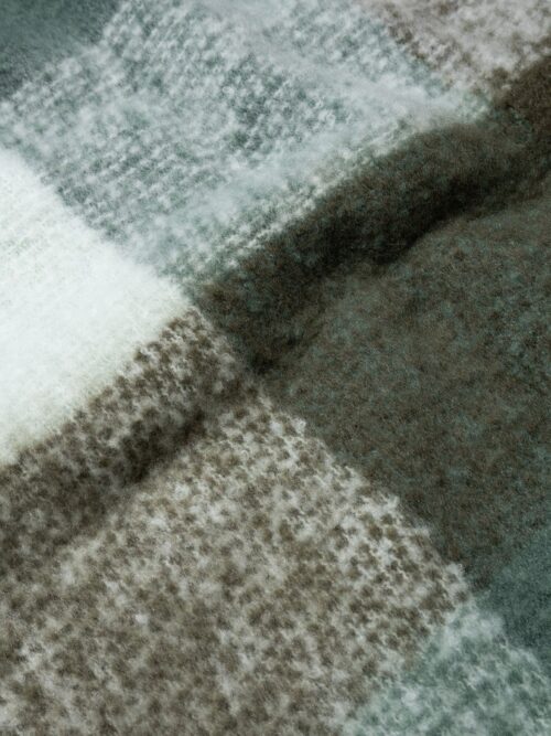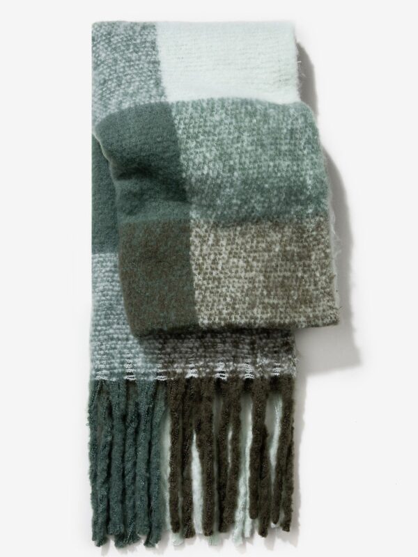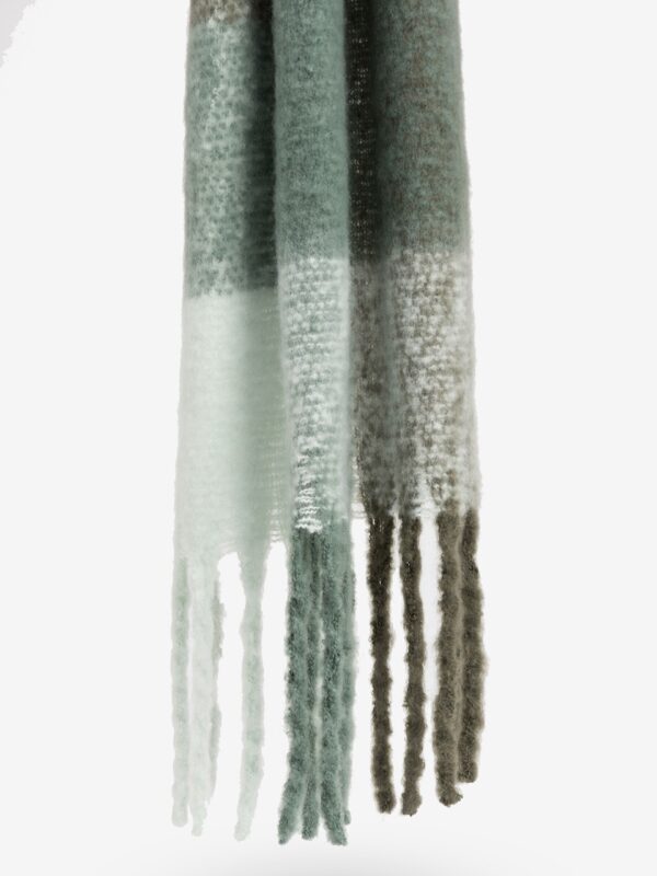 Bufanda rectangular, tipo pasmina, confeccionada con hilos entrelazados formando cuadrados de diferentes tonos de verde y acabado desflecado.