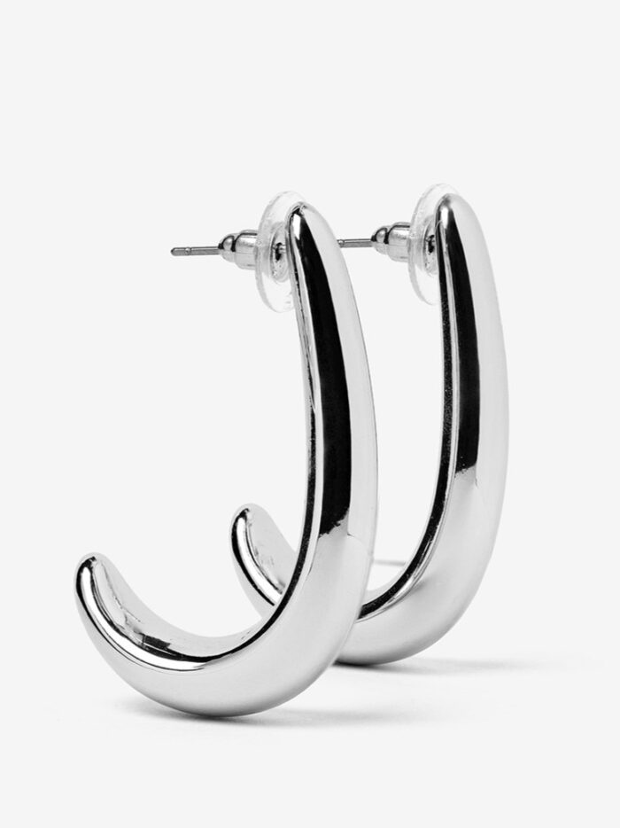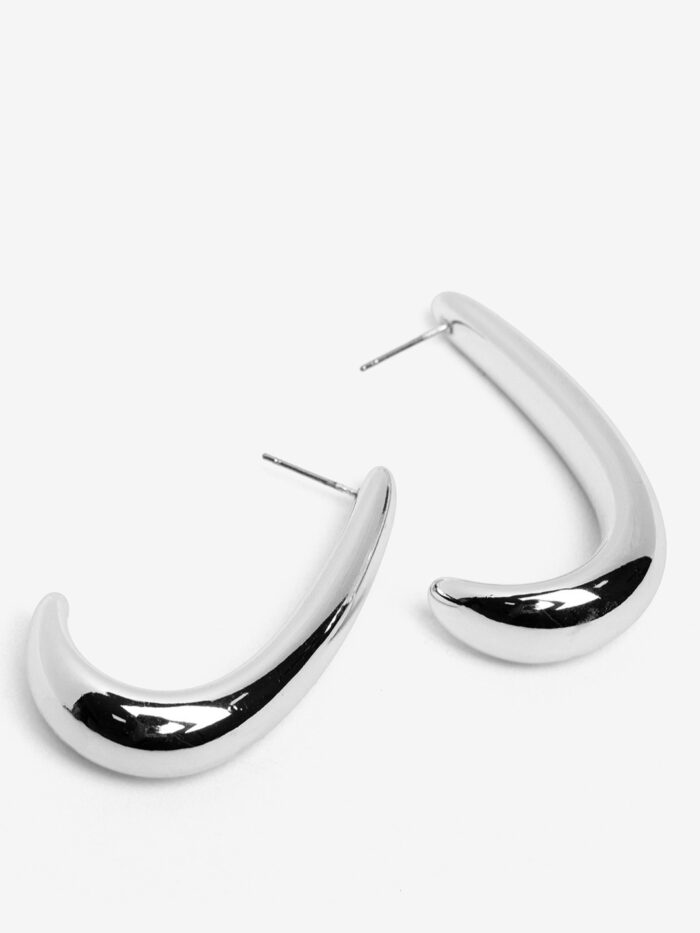 Pendientes grandes (5 cm.) en forma de media argolla plateada con diseño redondeado y acabado brillante, perfectas para un estilo moderno.