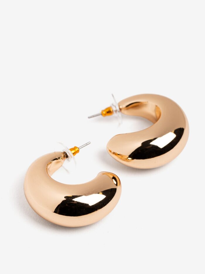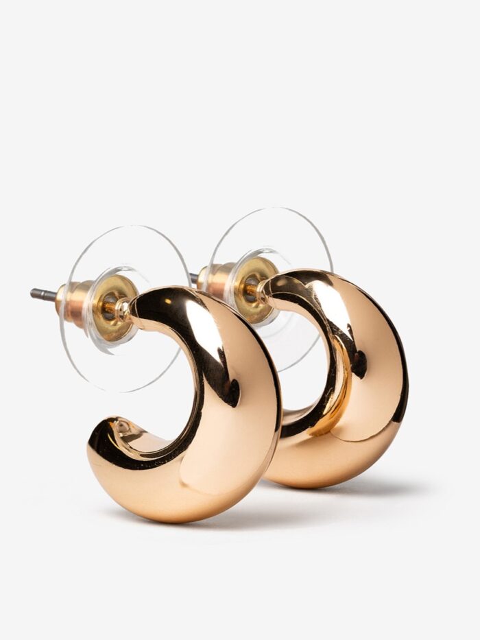 Pendientes medianos (3 cm.) en forma de medio aro dorado con diseño redondeado y acabado brillante. Diseño clásico con un toque moderno.