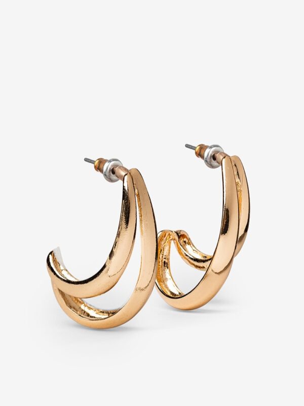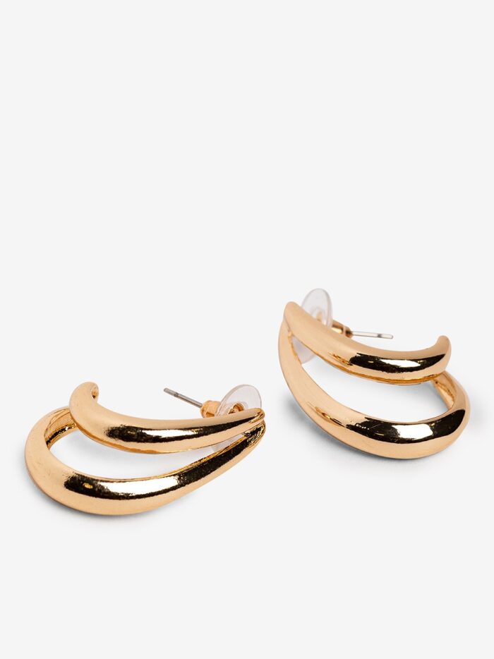 Pendientes medianos (3 cm.) de doble semi aro en tono dorado con diseño curvado y acabado brillante, ideales para cualquier ocasión.