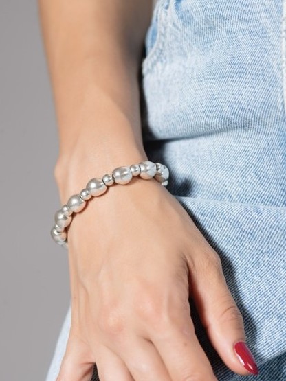 Pulsera elástica, bañada en plata, diseñada con una combinación de esferas de dos tamaños. Su tamaño de 6 cm. de diámetro permite ajustarse a diferentes muñecas.