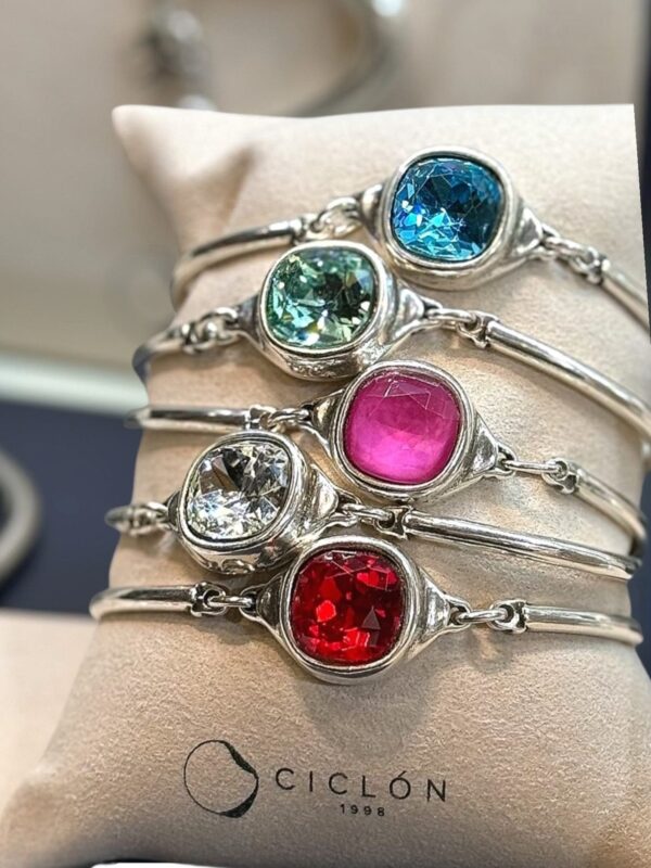 Pulsera, de la colección Emotion, de la firma CICLÓN. Esta pulsera semirígida, bañada en plata, presenta un charm central de cristal de Murano que añade un toque especial a tu muñeca. Modelo con cierre de mosquetón y una medida ajustable de 15 cm. hasta 18 cm., esta pulsera no solo es un accesorio encantador, sino también una expresión de estilo versátil y personal.