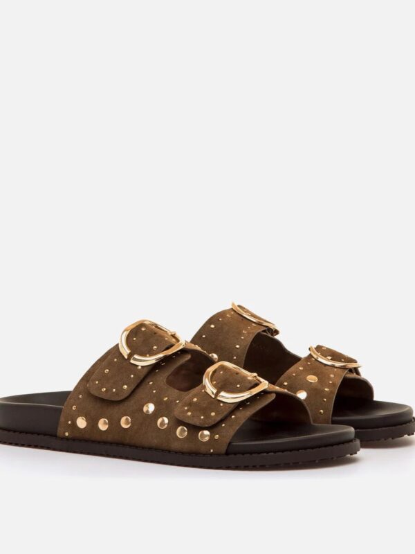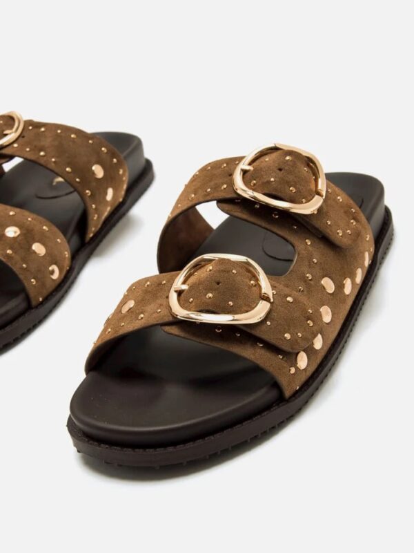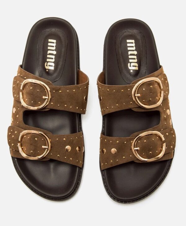 Sandalias planas tipo bio, de la marca Mustang, en color marrón chocolate. Modelo de estilo casual fabricadas en material sintético y diseñadas con dos tiras anchas, ajustables con hebillas metálicas doradas, y detalles de tachas que aportan un toque actual y llamativo. La planta acolchada ofrece una pisada cómoda y estable, mientras que la suela plana favorece una sensación segura y ligera al caminar. Unas sandalias versátiles que combinan fácilmente con distintos looks y destacan por su diseño cuidado y funcional.