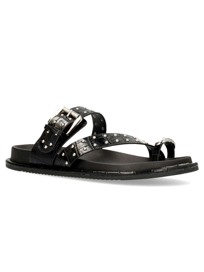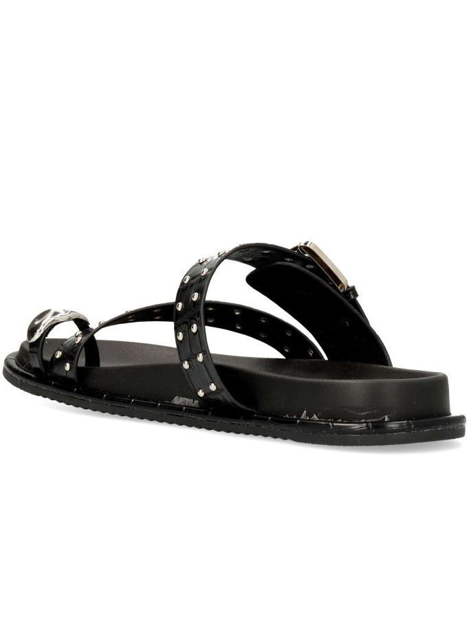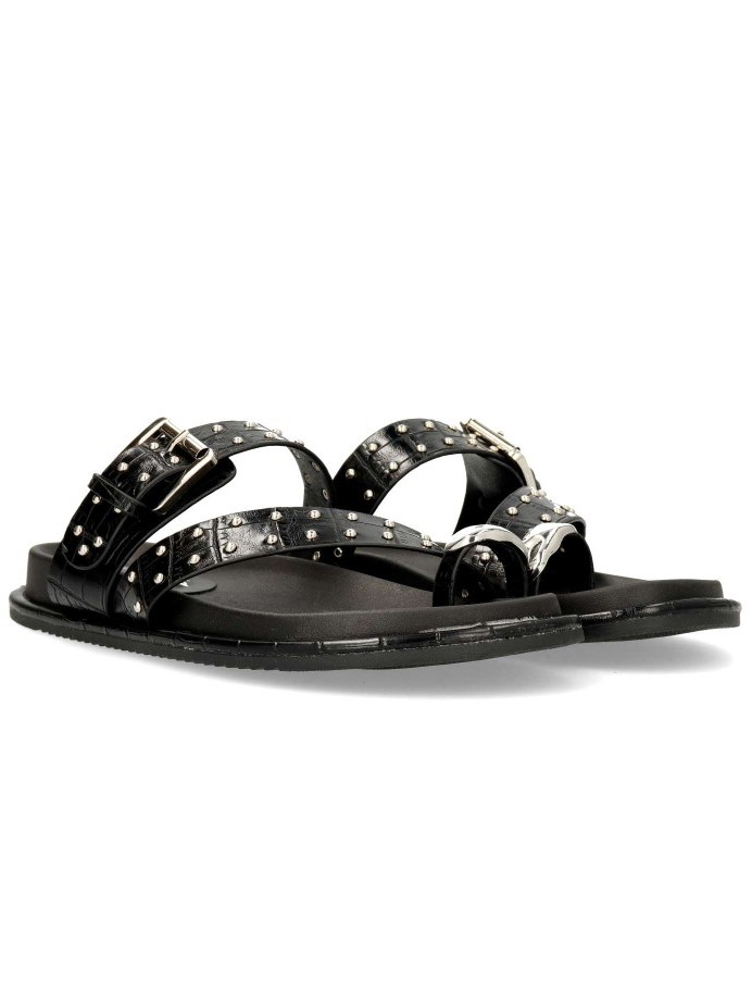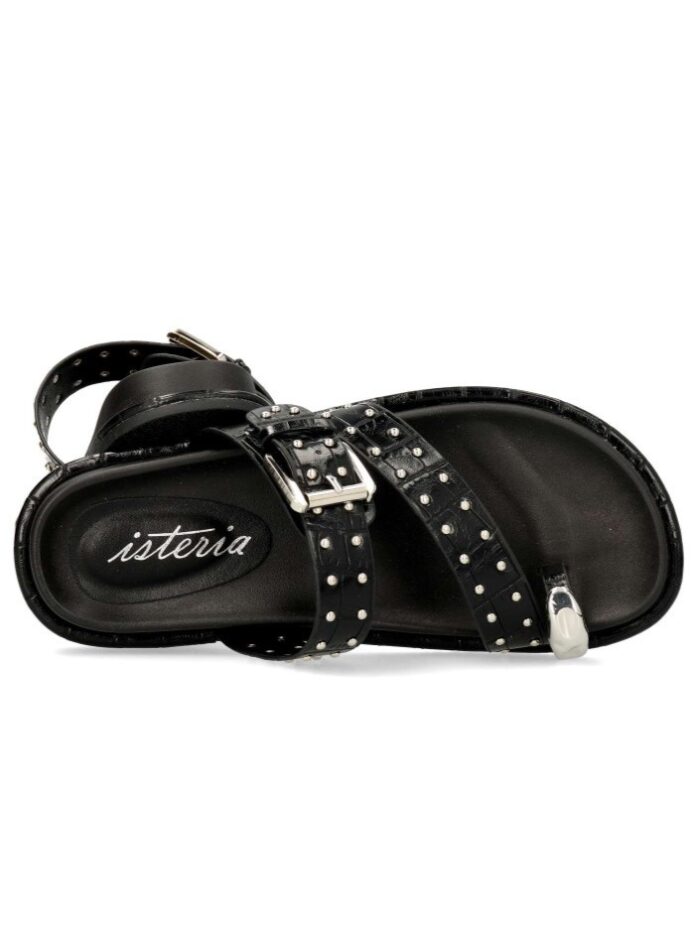 Sandalias planas, tipo bio, de la firma Isteria. Modelo en color negro fabricadas en material sintético y diseñadas con dos tiras estrechas, una de ellas ajustable con hebilla metálica plateada, decoradas con tachas y sujeción al dedo. La planta anatómica ofrece una pisada cómoda y estable, mientras que la suela de goma favorece una sensación segura y ligera al caminar.