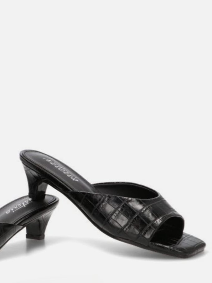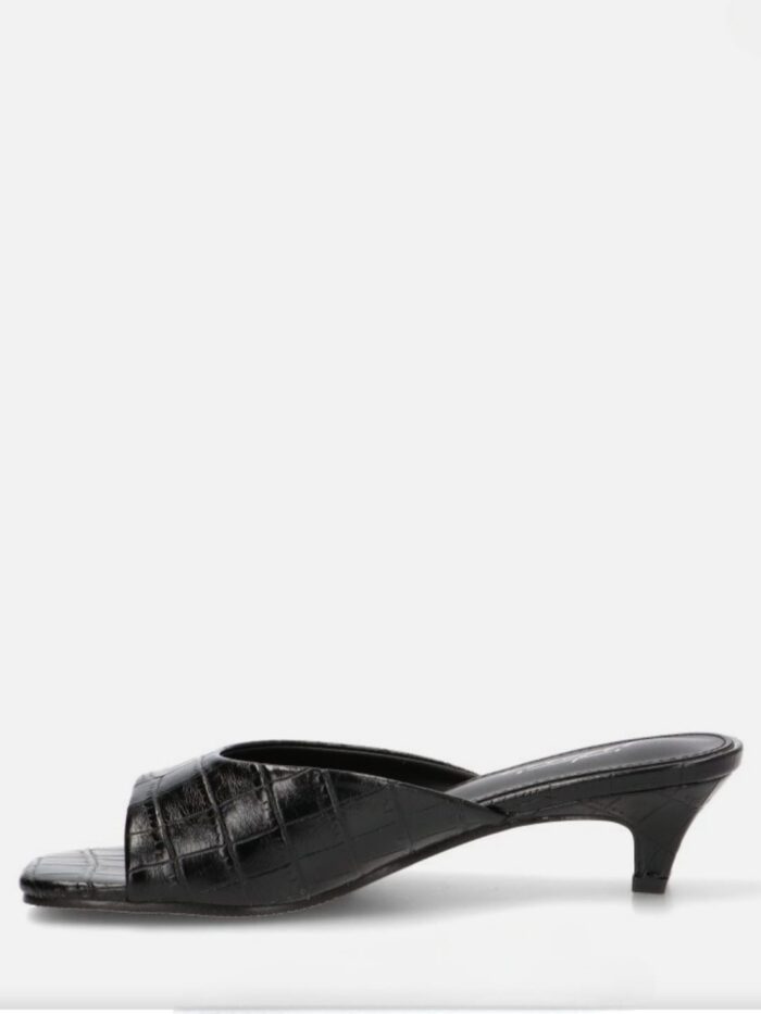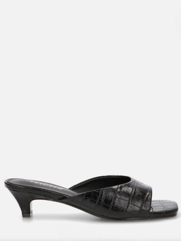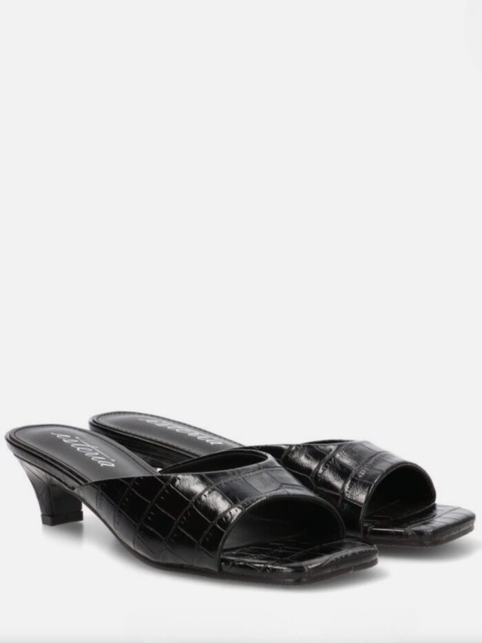 Sandalia destalonada fabricada en material sintético de color negro con grabado de apariencia piel de cocodrilo. Modelo de la firma Isteria diseñada con una pala estrecha en el centro y ancha en los laterales que sujeta y aporta comodidad a cada paso.