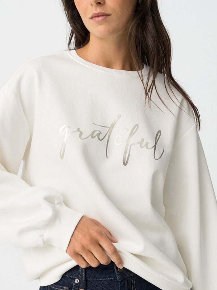 Sudadera de corte regular con estampado frontal de mensaje metalizado. Modelo con cuello redondo, manga larga y elástico en puños y cintura. Interior afelpado.