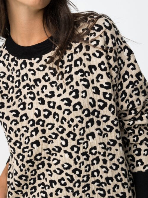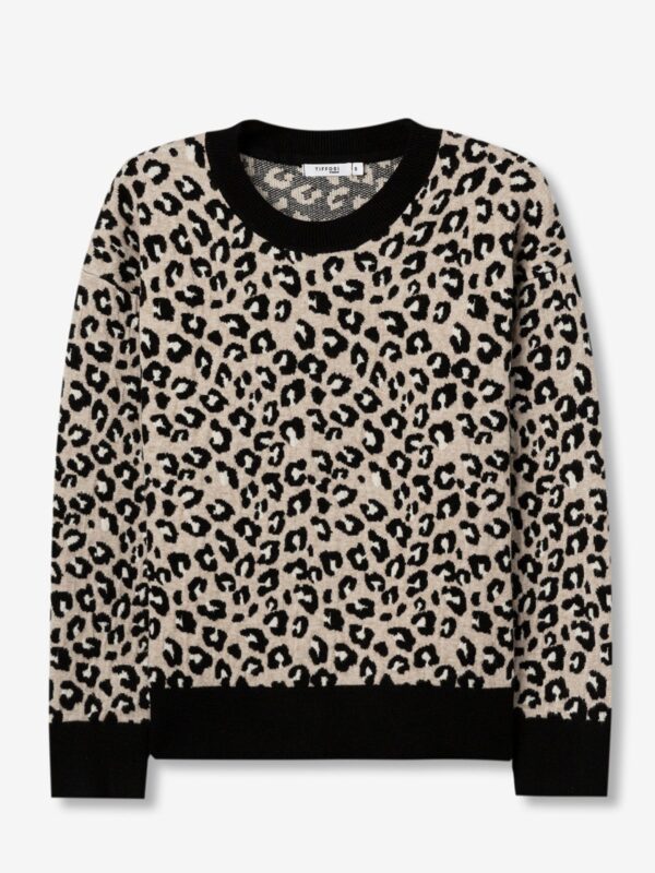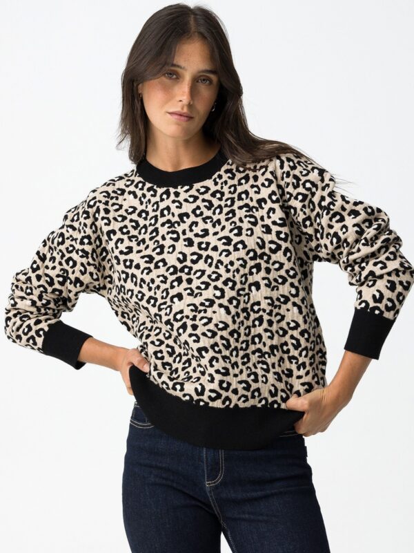 Suéter, de corte regular fit, confeccionado en tejido Jacquard. Modelo diseñado con estampado animal, cuello redondo y manga larga. Detalle de acabados de canalé negro en puños, cuello y cintura.