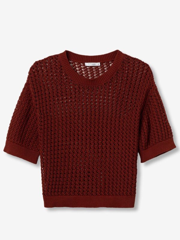 Suéter calado de algodón, confeccionado en punto, de la firma Tiffosi. Modelo diseñado con cuello redondo y manga corta con terminación de canalé en cuello, mangas y cintura. Cómodo, fresco y muy versátil a la hora de combinarlo con una falda o un pantalón de tiro alto.