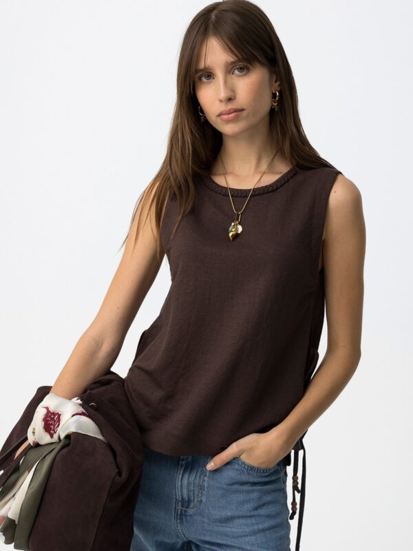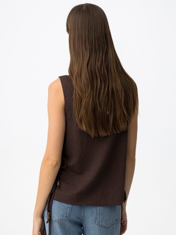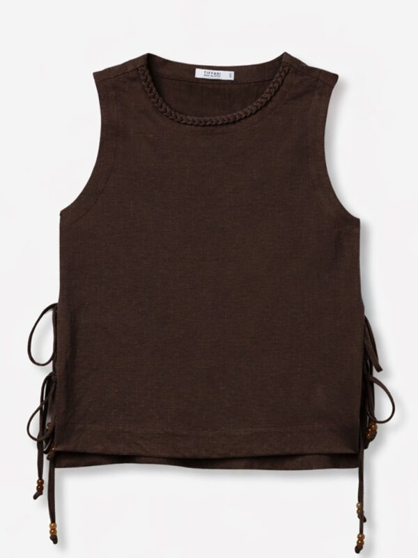 Top sin mangas, en color marrón chocolate, con cuello redondo acompañado de trenzado por la parte de delante. Modelo de corte recto y aberturas laterales cerrados con lazos decorados con cuentas en marrón semi transparente.