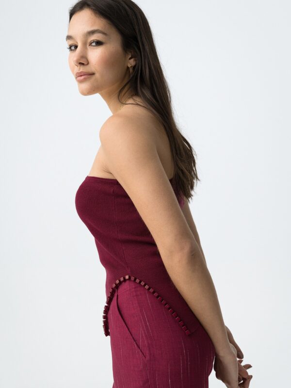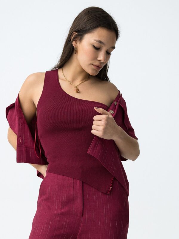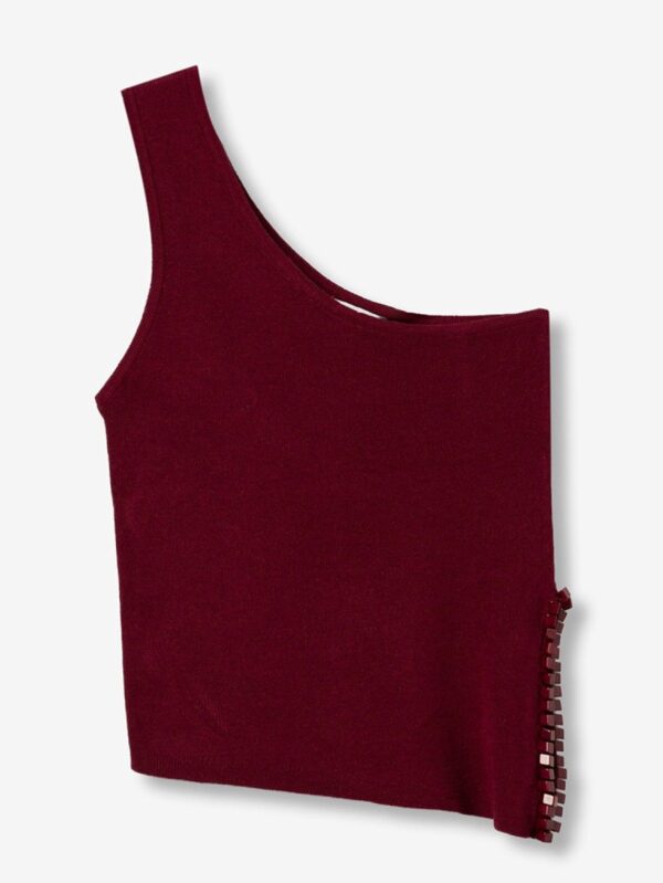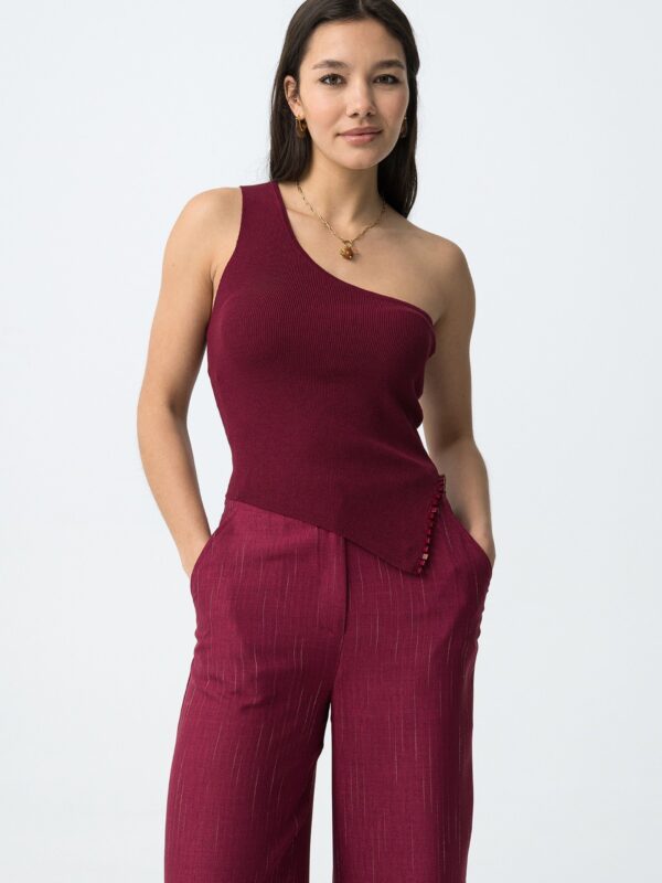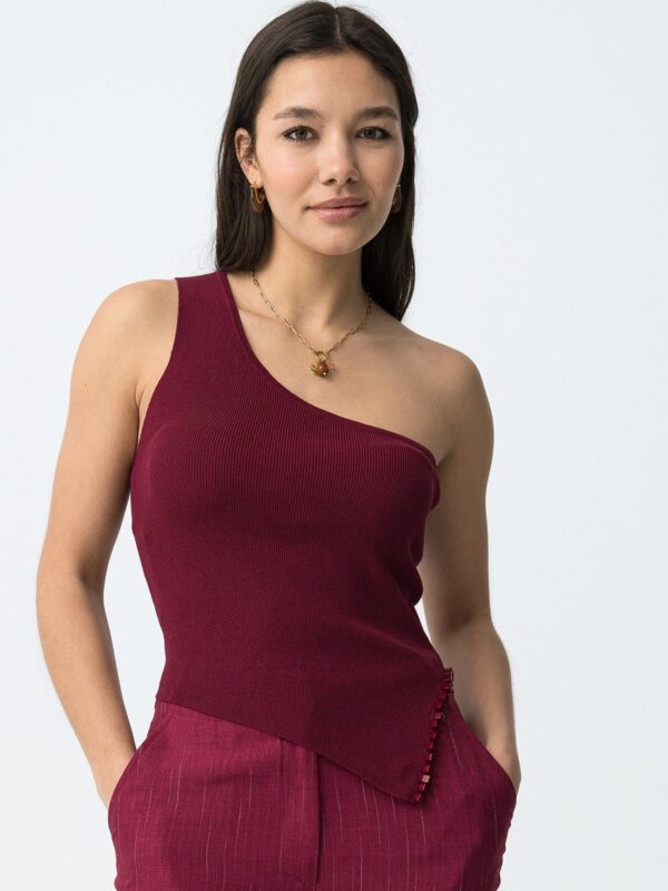 Top ajustado, en tono burdeos, de Tiffosi. Modelo de diseño asimétrico con tirante ancho a un hombro y escote recto. Detalle de abertura lateral, en el bajo, decorado con cuentas cuadradas del mismo color. Su diseño ajustado es ideal para combinar con pantalones fluidos o faldas para looks personales.