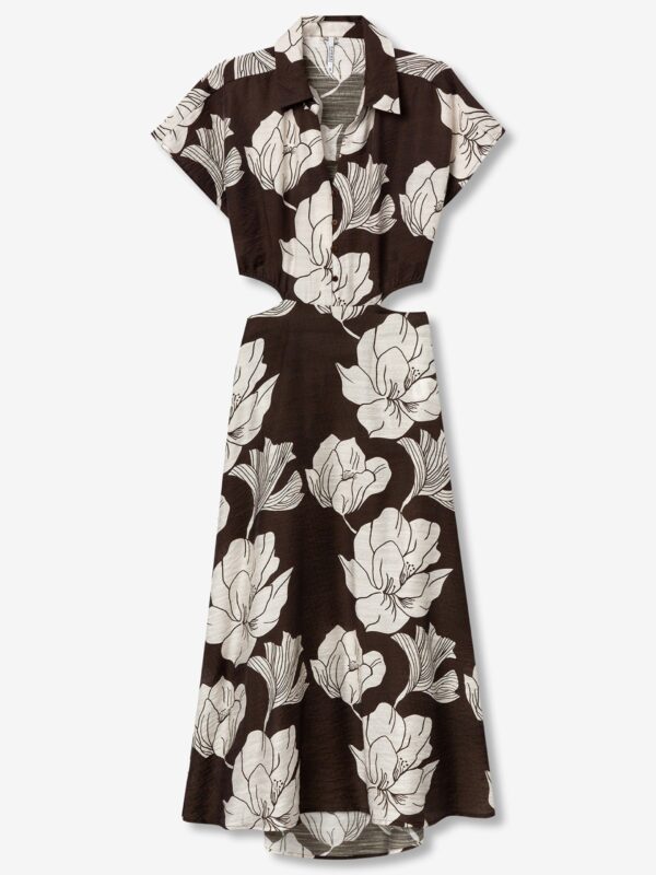 Vestido midi con cuello camisero, manga corta y escote en pico, de la firma Tiffosi. Modelo con estampado floral sobre fondo marrón y de diseño moderno con botones por delante hasta la cintura y abertura con elástico en cintura y espalda. El corte entallado en la parte de arriba y la falda fluida crean una figura favorecedora y femenina ideal para cualquier momento del día o de la noche.