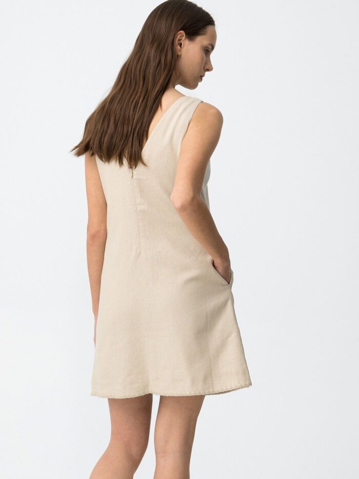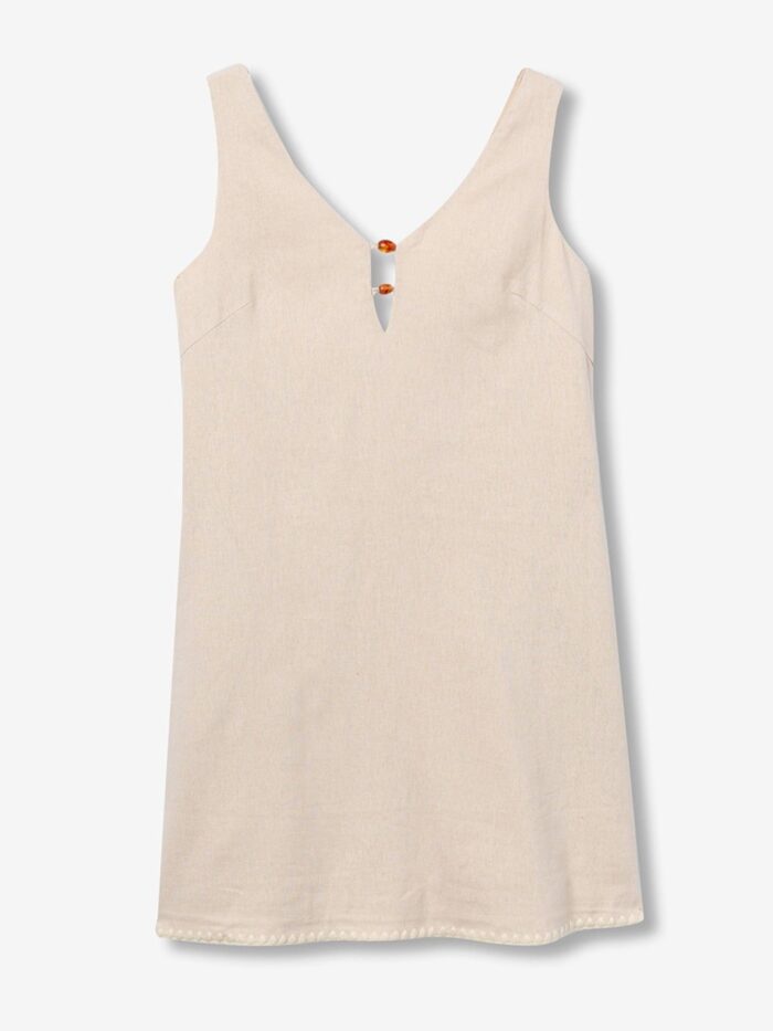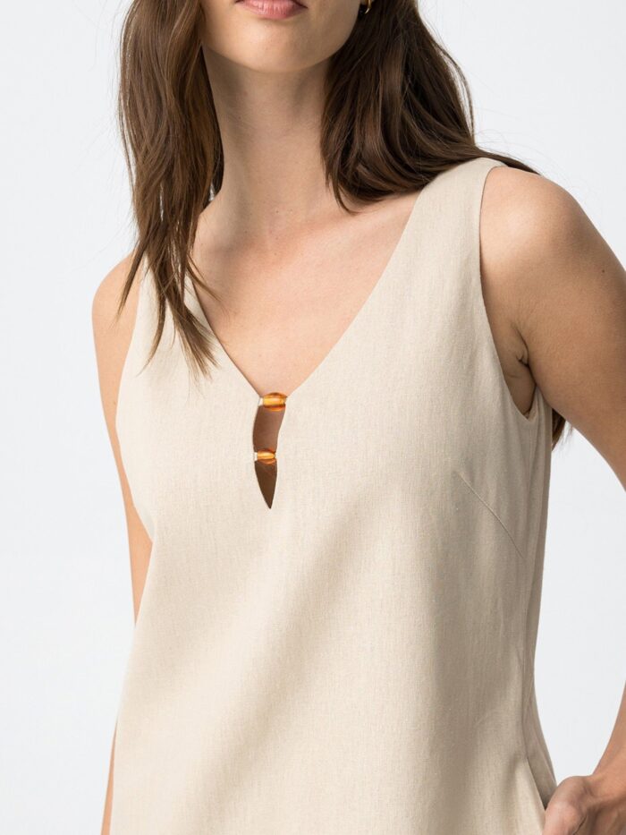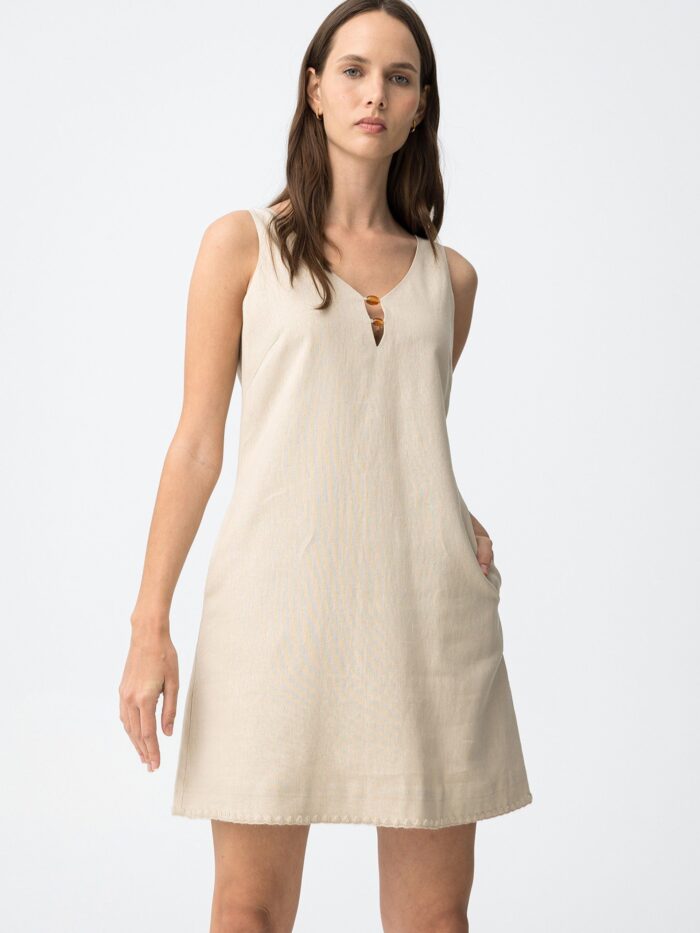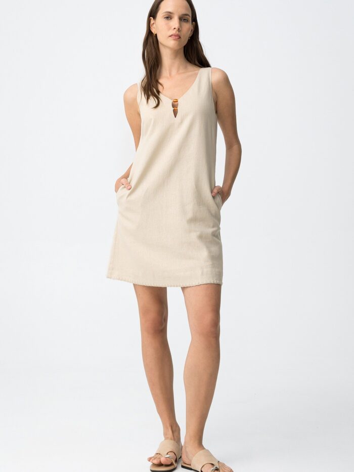 Vestido corto de la marca Tiffosi, en color beige, de cuello en pico, con abalorios en el escote, y cierre de cremallera «invisible» por la espalda. Modelo diseñado con bolsillos laterales y confeccionado con mezcla de lino que aporta cuerpo para llevarlo y frescura para lucirlo tanto de día como de noche.