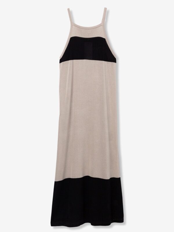 Vestido midi, de punto, con corte recto y tirantes finos para un look minimalista y moderno. Su diseño sin mangas y la combinación de colores tostado y negro lo hacen perfecto para ocasiones casuales o como parte del atuendo para la oficina con una chaqueta.