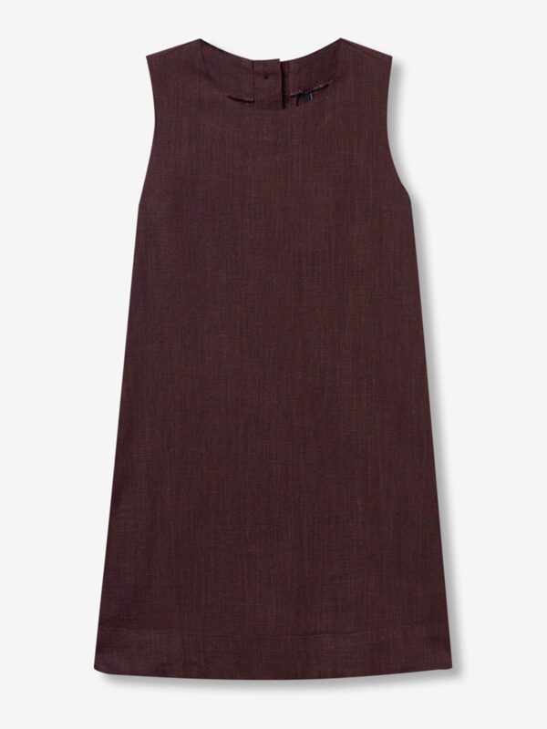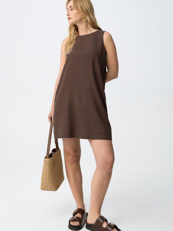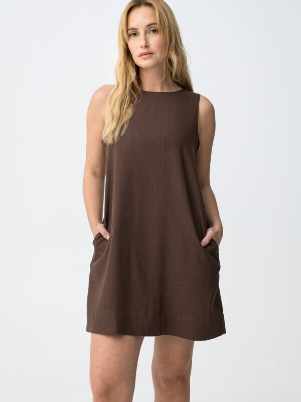 Vestido corto, de la marca Tiffosi, en color marrón chocolate. Modelo de cuello redondo abotonado por detrás y diseñado con bolsillos laterales y cierre de cremallera «invisible» oculta en costura en un lateral. Este vestido está confeccionado con forro interior que aporta un plus de comodidad