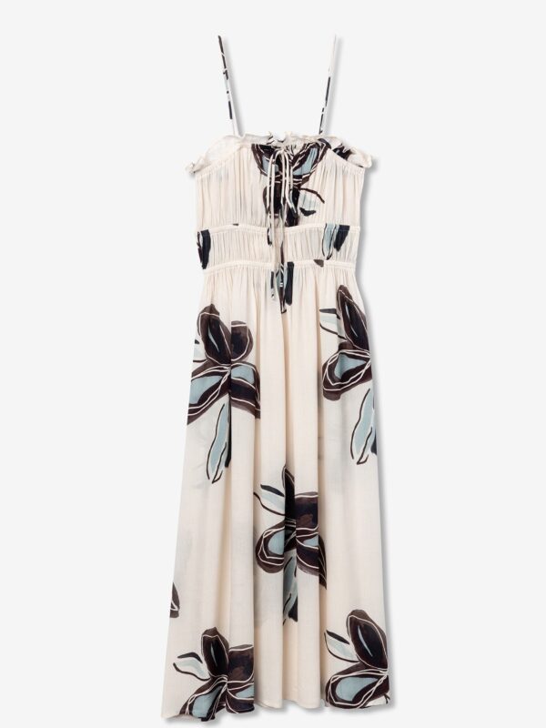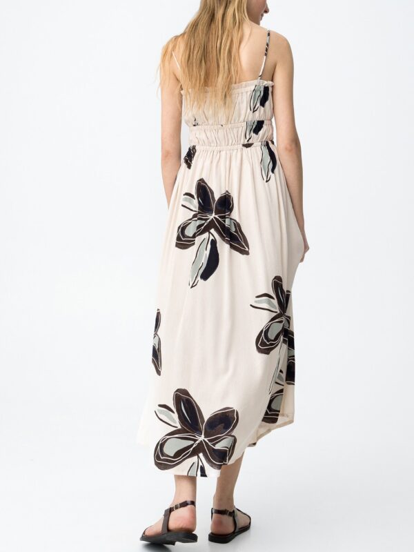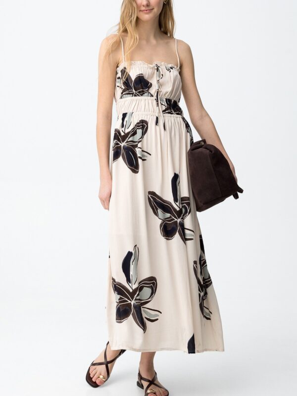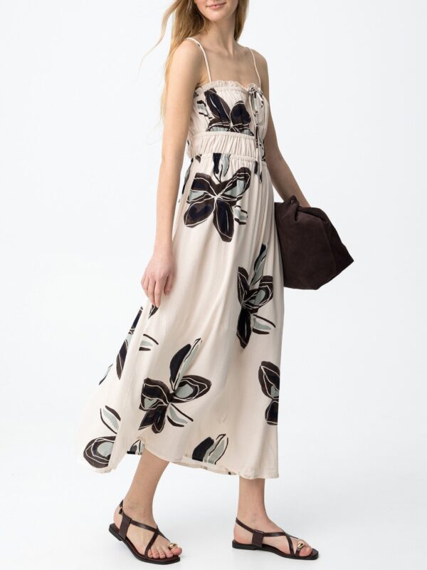 Vestido midi, de estampación floral sobre fondo color beige, de la marca Tiffosi. Modelo de corte ajustado, escote recto con elástico y cordón para lazada, y tirantes finos. Su diseño con elásticos bajo pecho proporciona un ajuste personal realzando la figura. Además está confeccionado con con forro interior hasta media pierna para mayor comodidad.