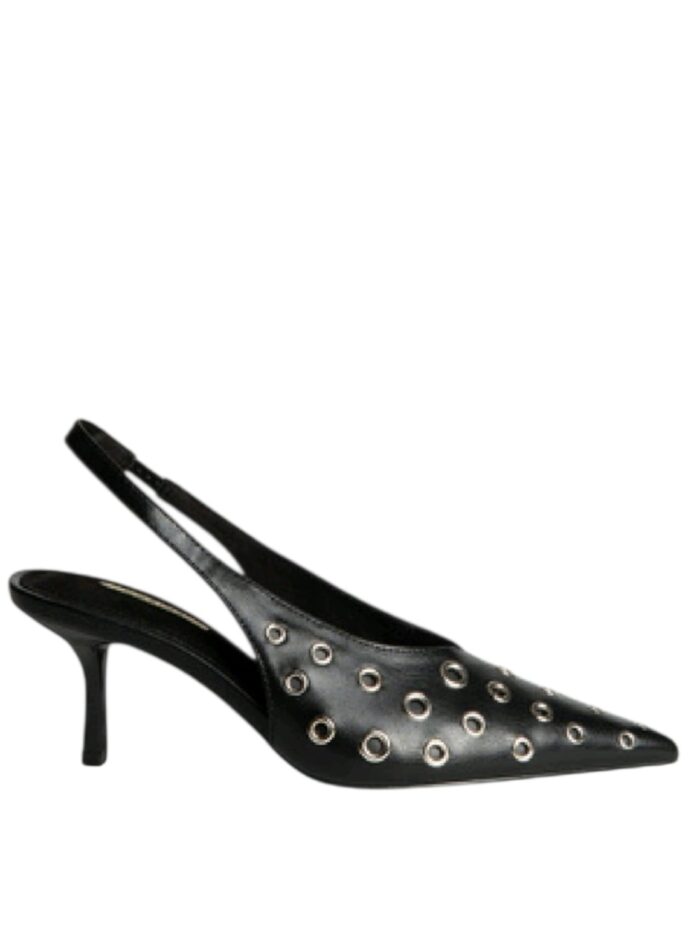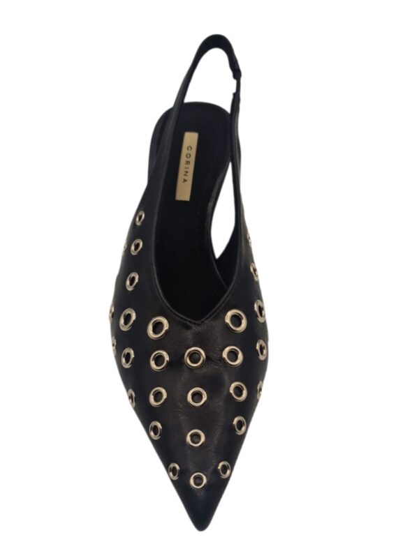 Zapato de la firma Corina de punta fina con tacón medio y sujeto al tobillo mediante tira con elástico. Modelo fabricado en sintético de alta calidad y diseñado con remaches cromados de diferentes tamaños en todo el zapato.
