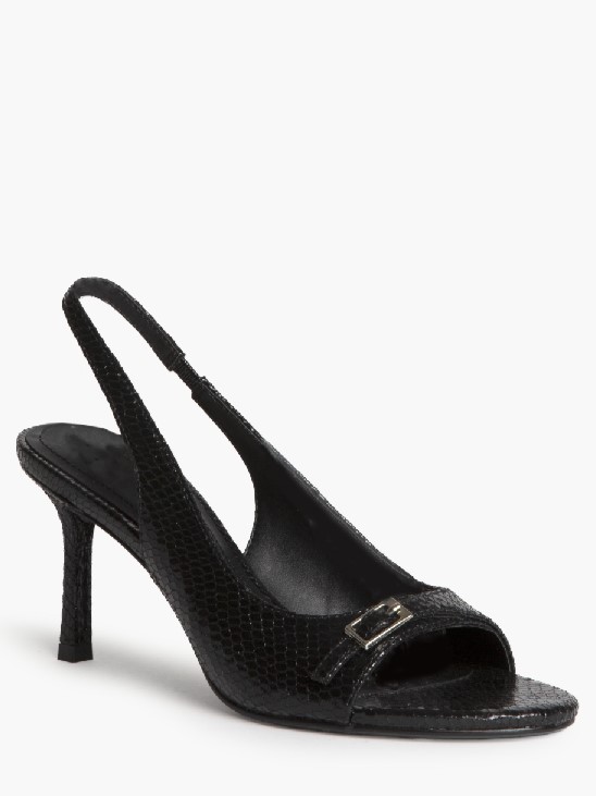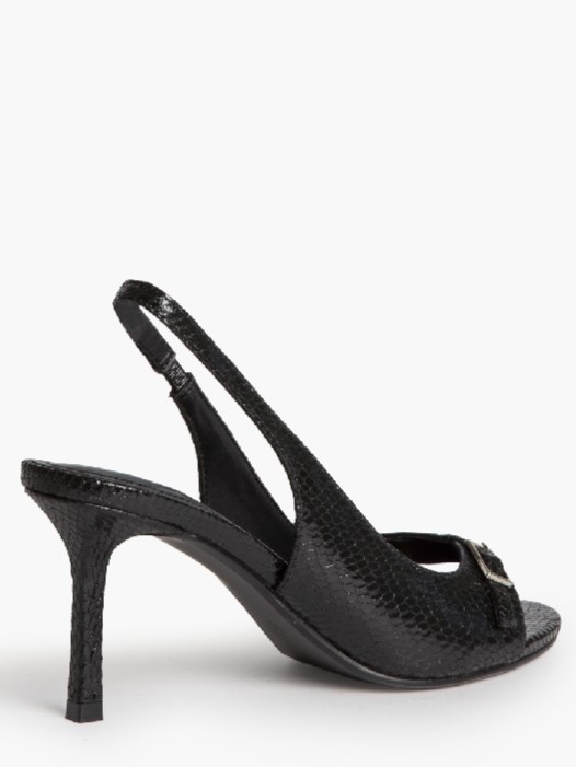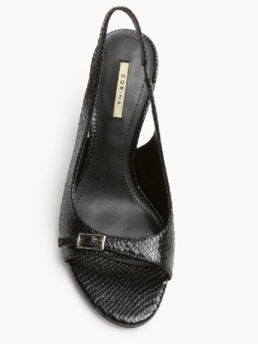 Sandalia destalonada, de tacón medio, de la firma Corina. Modelo en color negro acharolado de textura de piel de serpiente con sujeción al talón con correa y un pequeño elástico. Detalle de pequeña hebilla plateada en la pala.