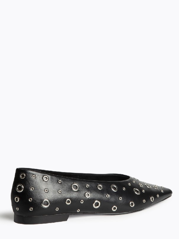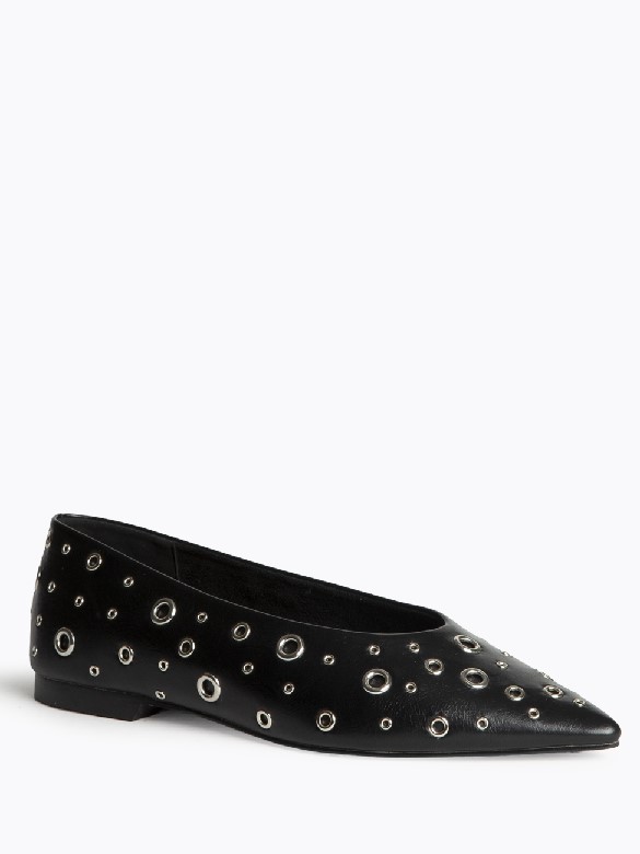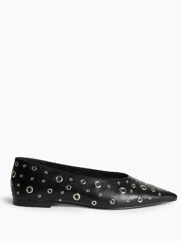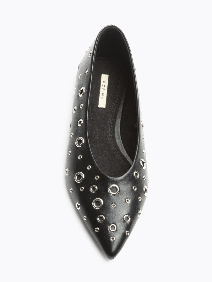 Zapato plano de punta fina, tipo bailarina, de la firma Corina. Modelo fabricado en sintético de alta calidad y diseñado con remaches cromados de diferentes tamaños en todo el zapato.